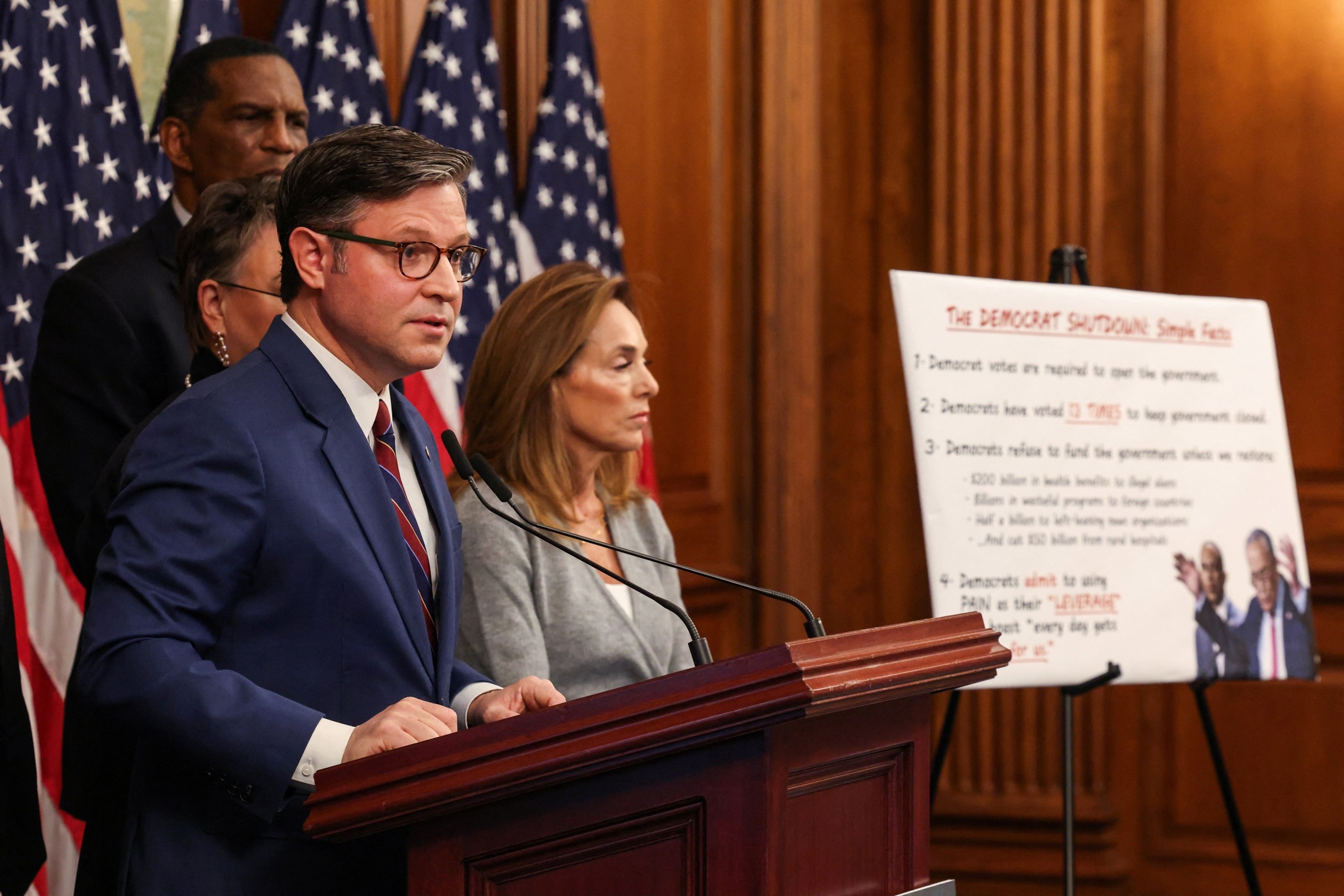 House Speaker Mike Johnson speaks during a press conference to discuss the ongoing government shutdown, on Capitol Hill in Washington, DC, on October 28, 2025.